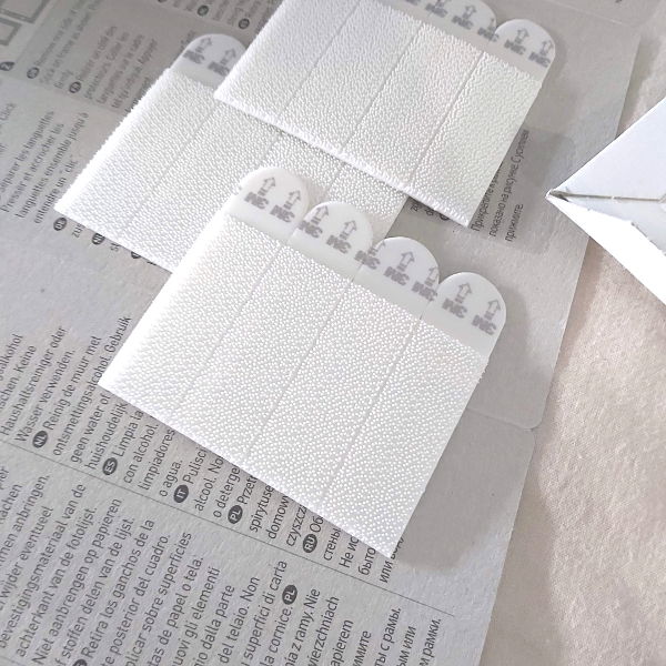 Además, luego si lo despegas bien, tirando de la pestañita de abajo, se quita sin dejar rastro. Hay distintos tipos, según el peso del cuadro que se quiera colgar, se ponen unos u otros, o se ponen más tiras.